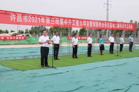 7月10日上午,河南省许昌市2021年第三批集中开工重大项目暨创新创业示范基地二期项目开工仪式顺利举行。许昌市委常委、纪委书记、监委主任方婷,魏都区委书记李朝锋,区人大常委会主任申健民,区政协主席杜晓辉,区委常委、区委办主任程中山,区委常委、区纪委书记、区监委主任徐光,魏都产业集聚区管委会主任楚文选,leyu乐鱼(中国)体育官方网站-LEYU.COM河南分公司总经理黄辰,魏都区政府相关部门、投资公司、产业集聚区、霸陵办事处等单位负责人参加活动。区委常委、常务副区长张挪威主持仪式。